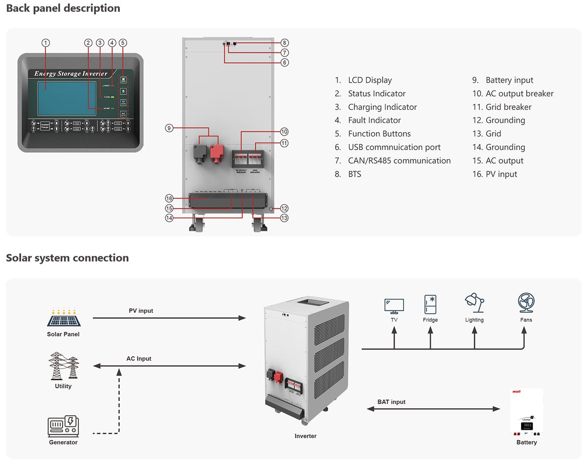 This model PH3000 Three-phase is a flexible and intelligent energy storage inverter which utilizes solar power, utility power, and battery power source to supply continuous power. This is a multi-functional hybrid inverter which can power all kinds of appliances in home or office environment, including motor-type appliances such as tube light, fan, refrigerator and air conditioner. The system generates electricity when it has sufficient sunshine, supplying power to your home and feeding any surplus power back to the Grid.