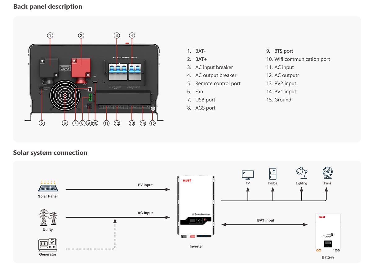 PV3600 PRO series is a multi-function inverter ,combining functions of inverter and MPPT solar charger controller, solar charger and battery charger to offer uninterruptible power support. The comprehensive LCD display offers userconfigurable and easy-accessible button operation such as battery charging current, AC/solar charger priority, and selectable input voltage based on different applications.
