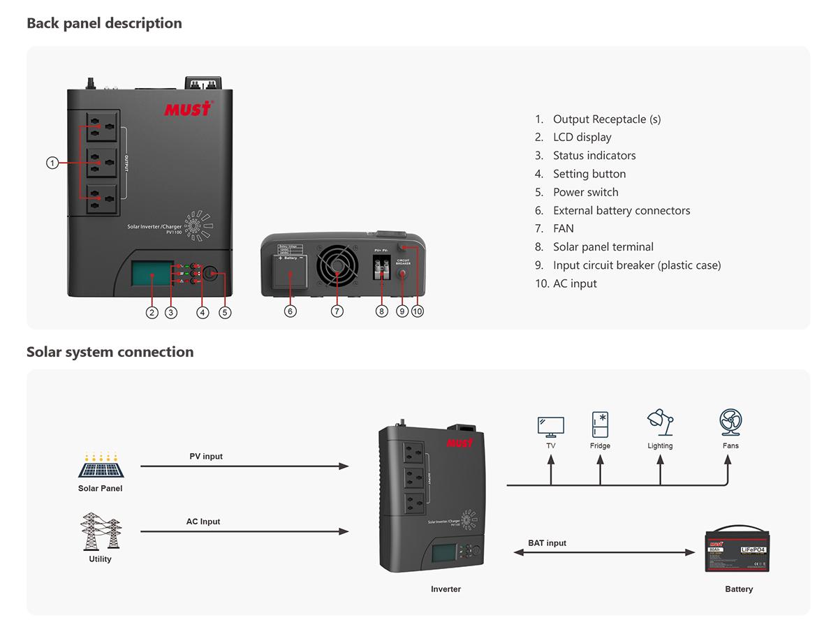 PV1100Plus is a cost effective , intelligent hybrid off grid solar inverter. The LCD display offers friendly user-configurable button adjustment such as battery charging current, AC/solar charger priority and DC priority. When battery voltage is low, it will automatically switch to AC grid to supply continuous power to the loads. It suitable for personal home use.