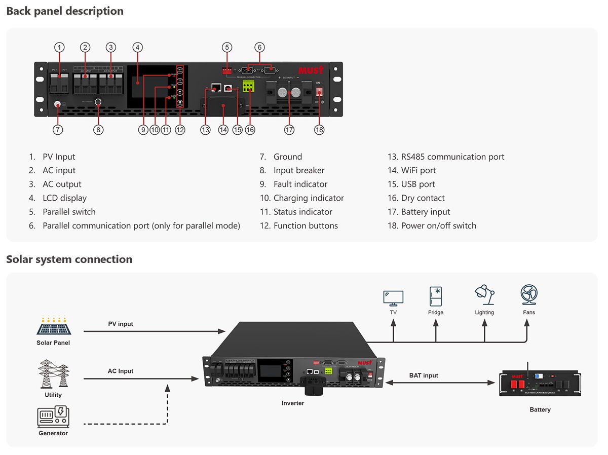 PV5000 PRO is a multi-function inverter/charger, combining functions of inverter, MPPT solar charger and battery charger to offer uninterruptible power support in portable size. PV5000 PRO Series can run without battery. The Maximum PV array open circuit voltage can reach 450V and MPPT voltage is 150~430Vdc, which Can help customers make full use of solar energy.