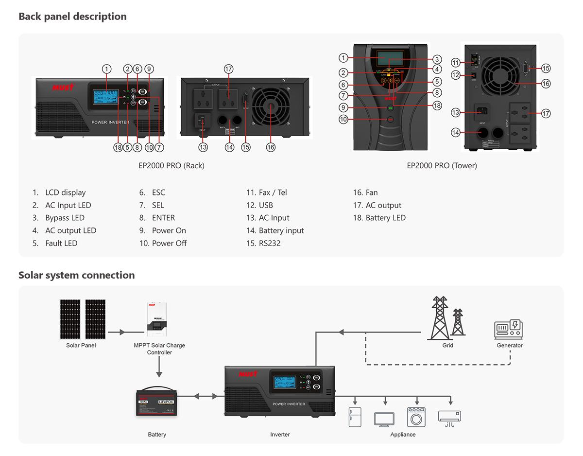 EP2000 PRO series inverter is a cost effective, intelligent with UPS function. The comprehensive LCD offers user-configurable and easy-accessible button adjustment such as battery charge current, battery charge voltage, frequency, buzzer etc. It’s perfect for the user who need a simple and economical inverter,with user-friendly installnation and setting.Tower and rack design available for different choices.