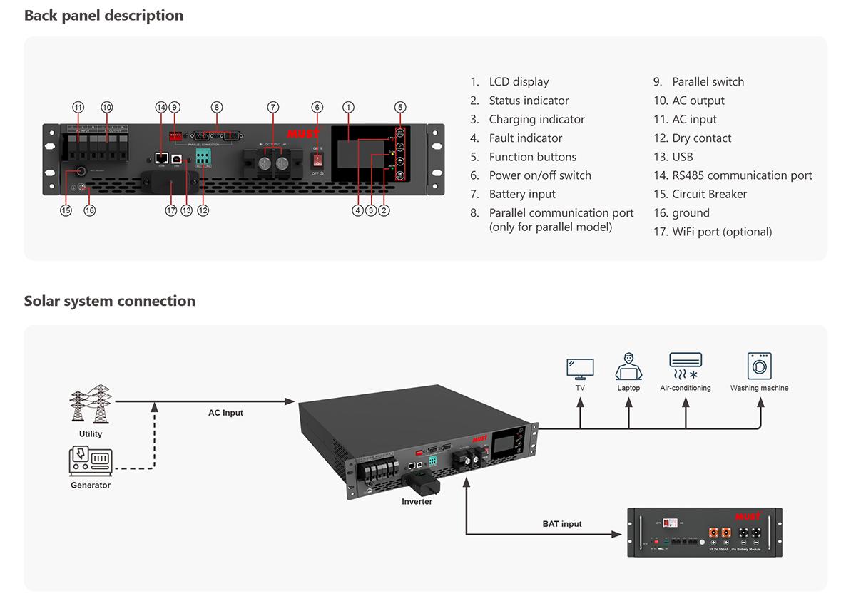 This is a multi-function inverter/charger ,combining Functions of inverter, battery charger to offfer uninte uninterruptible power with portable size. Its comprehensive LCD display offers user-configurable and easy-accessible button operation such as battery charging current, AC charger, and acceptable input voltage based on different applications.