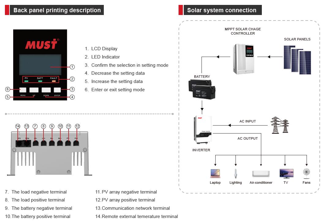 ■ Protection: PV array short circuit, PV reverse polarity, Battery reverse polarity, Over charging, Output short circuit