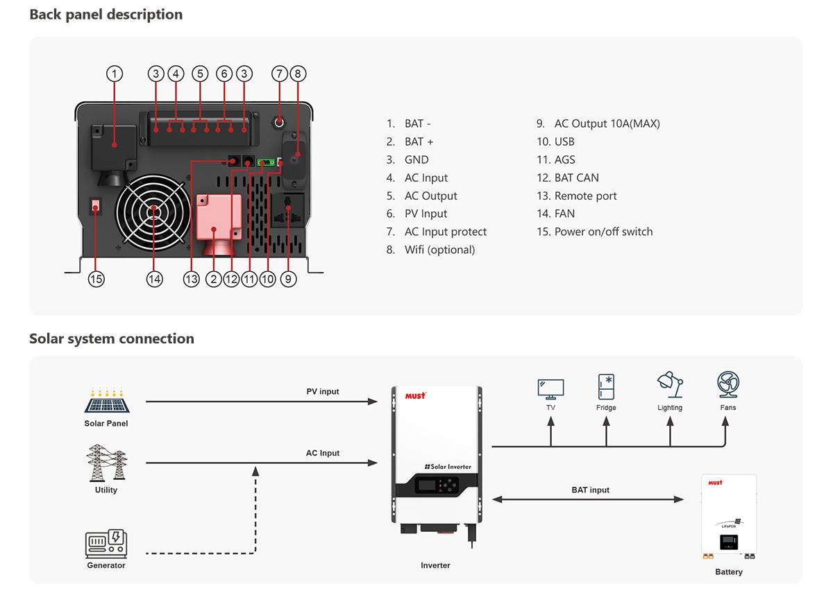 PV3000 VPM series is very economical pure sine wave solar inverter, inbuilt with 60A MPPT Charger and AC Charger from 20A to 60A; Solar/AC priority is configurable, when setting solar priority, solar will charge batteries as first priority, and AC can also charge batteries when solar charger current is too lower, in this way system charge is optimazed best. It enables inverter to operate with all kinds of home appliances.