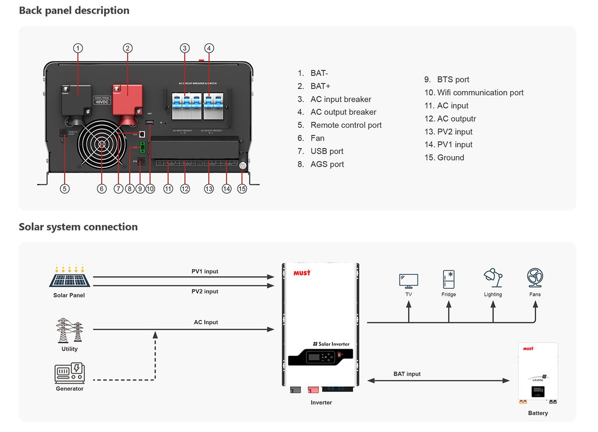 PV3600 TLV series is a multi-function inverter ,combining functions of inverter and MPPT solar charger controller, solar charger and battery charger to offer uninterruptible power support. The comprehensive LCD display offers userconfigurable and easy-accessible button operation such as battery charging current, AC/solar charger priority, and selectable input voltage based on different applications.